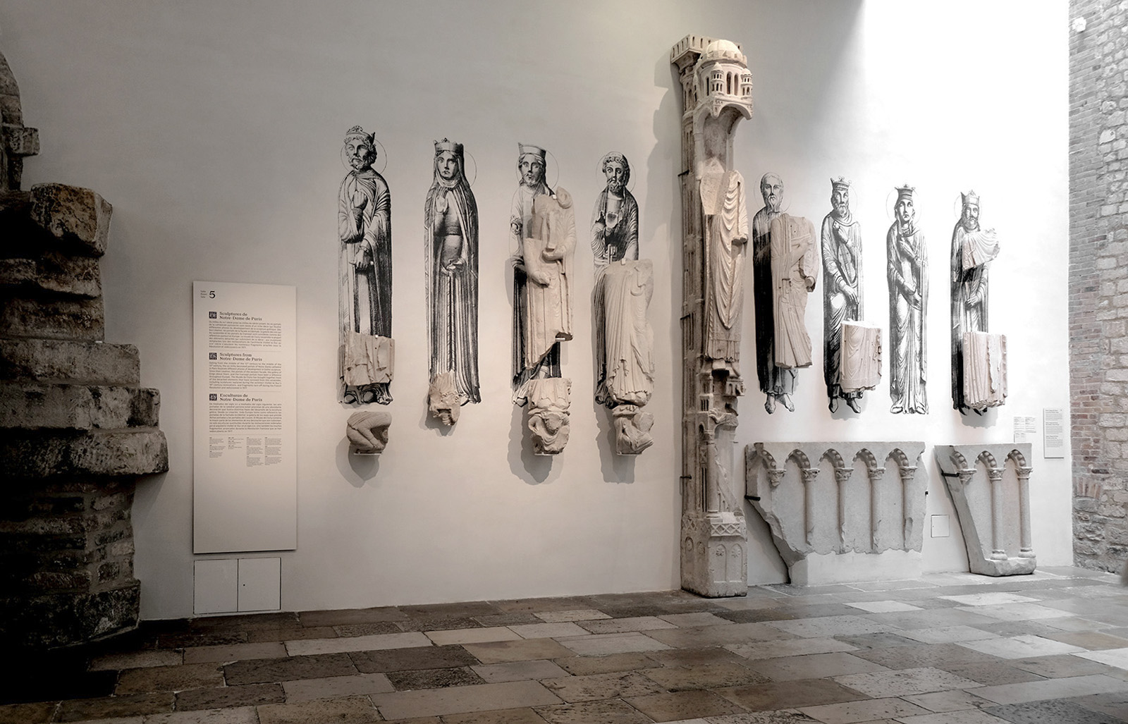 Cette mise en scène se construit autour du dialogue entre les silhouettes des statues-colonnes et les fragments de pierre, qui a été un des temps forts de l'exposition « Faire parler les pierres. Sculptures médiévales de Notre-Dame » cette fois déployé sur le plan unique du mur de la salle.